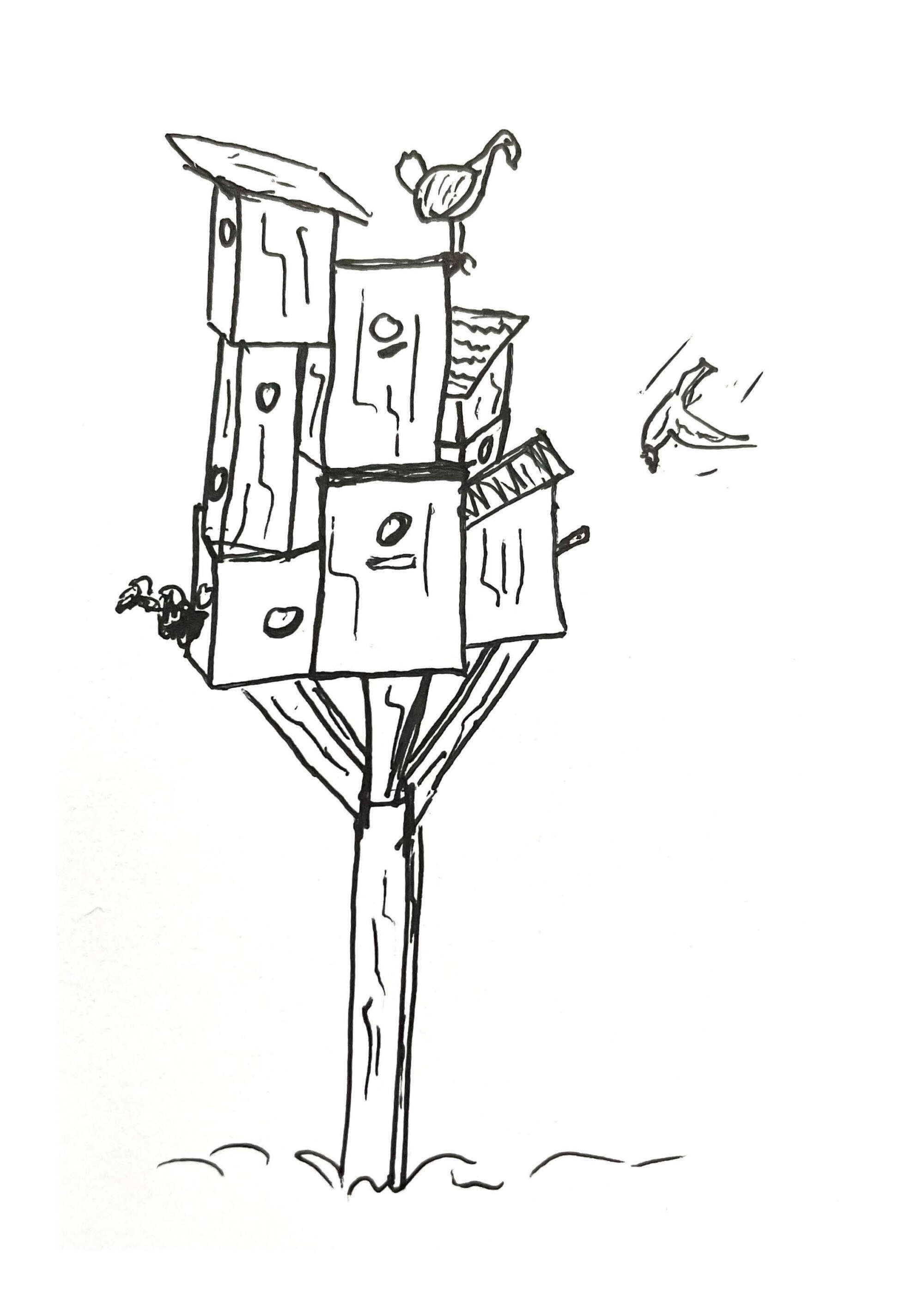 Das „Mehrparteienvogelhaus“ präsentiert eine Verbindung von Kunst und Natur. Mit mehreren separaten Nistplätzen und Futterstellen bietet die Skulptur einen Lebensraum für verschiedene Vogelarten. Die Auswahl der Einfluglochgrößen ermöglicht eine gezielte Anziehung bestimmter Vögel, die sich im städtischen Raum wohlfühlen.